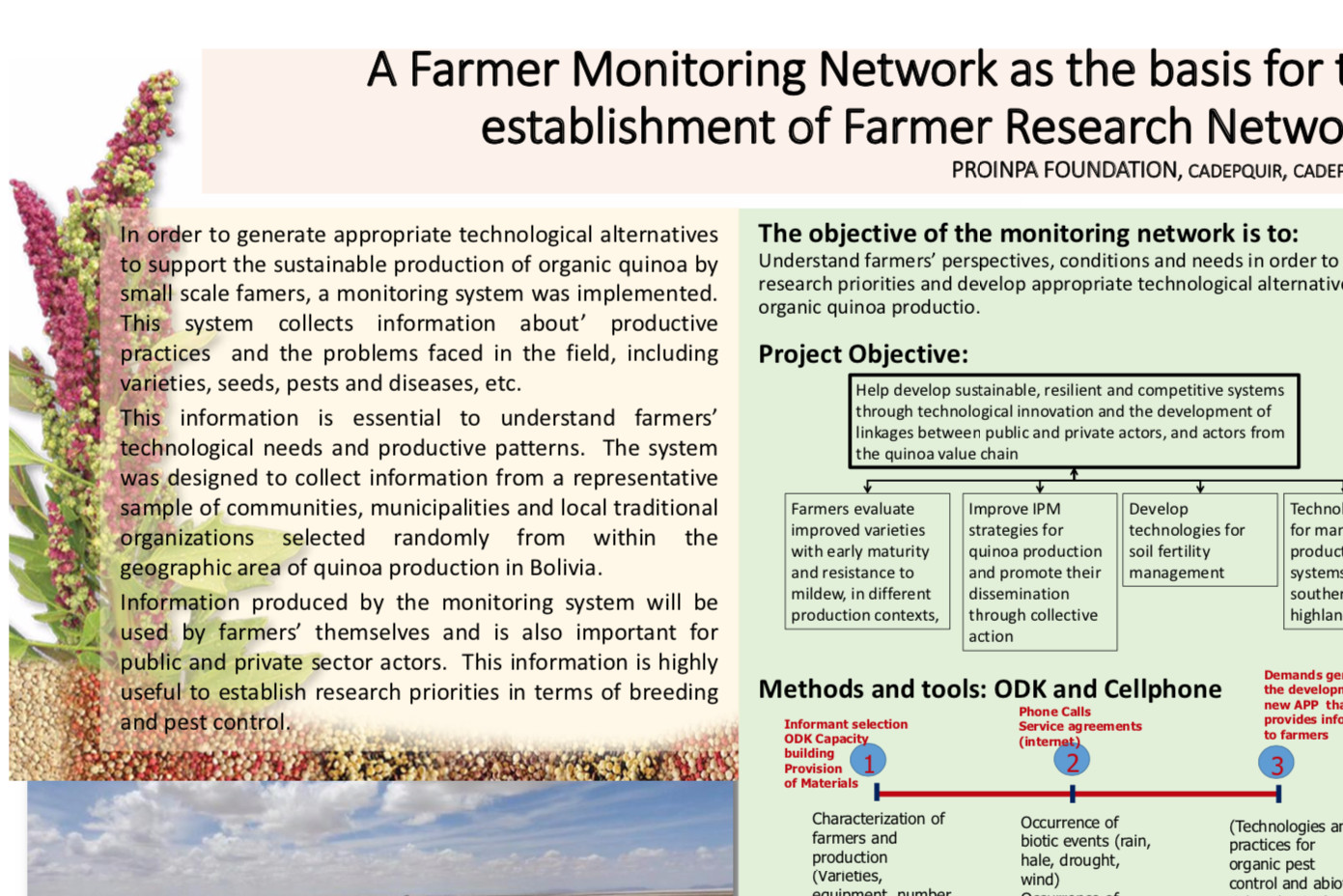 A poster/leaflet giving information about an FRN project implemented with quinoa farmers in Bolivia. Summarise...